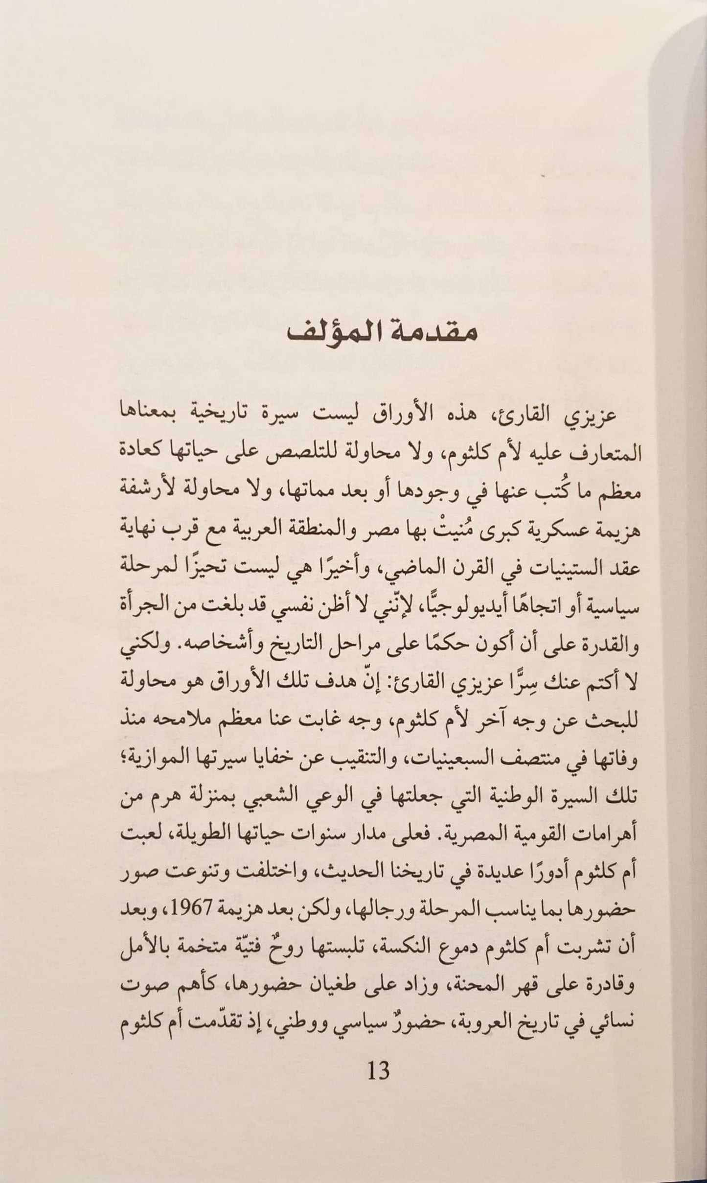 يعد الكتاب محاولة للبحث عن وجه آخر لأم كلثوم، وجه غابت عنا معظم ملامحه منذ وفاتها في منتصف السبعينيات، والتنقيب عن خفايا سيرتها الموازية؛ تلك السيرة الوطنية التي جعلتها في الوعي الشعبي بمثابة
