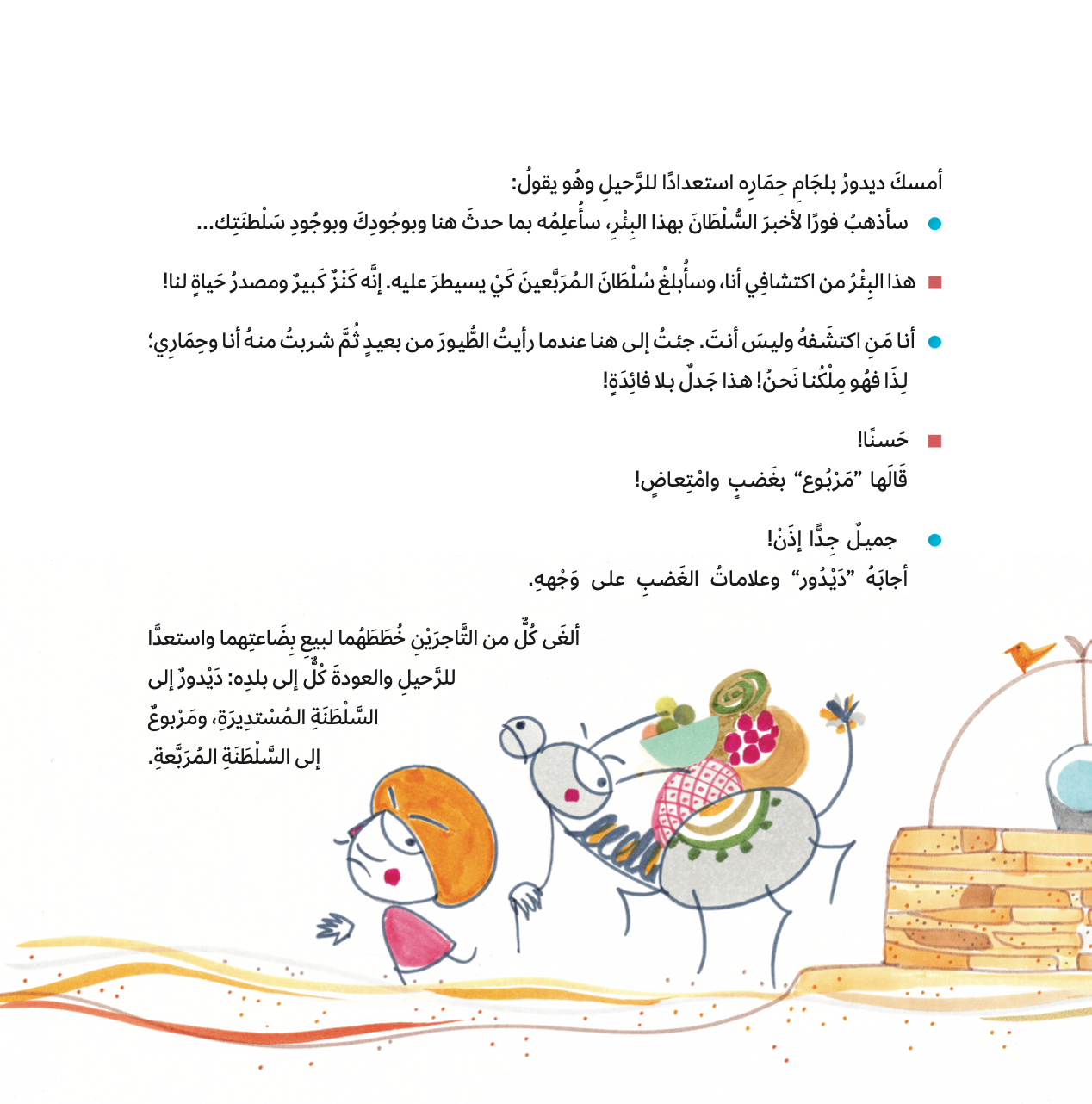 كان هناك تاجران يعيشان في سلطنتين بعيدتين، جميلتين لكن مختلفتين كل الاختلاف: السلطنة المدورة والسلطنة المربعة. ذات يوم عاصف جدًا في قلب الصحراء التقى التاجران عند بئر ظن كل منهما أنه أول من اكتشفه؛ فسارع كل تاجر لإخبار سلطانه