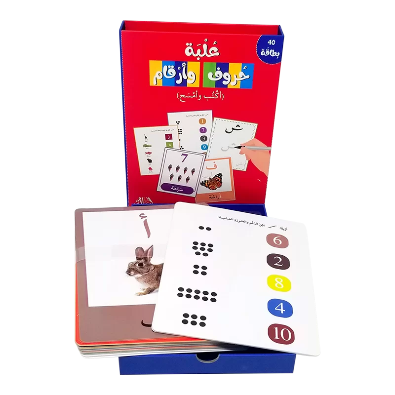 في الداخل، ستجد 40 بطاقة على الوجهين، قلما للكتابة والمسح وبعض التمارين للمراجعة ليتعلم طفلك ويستمتع