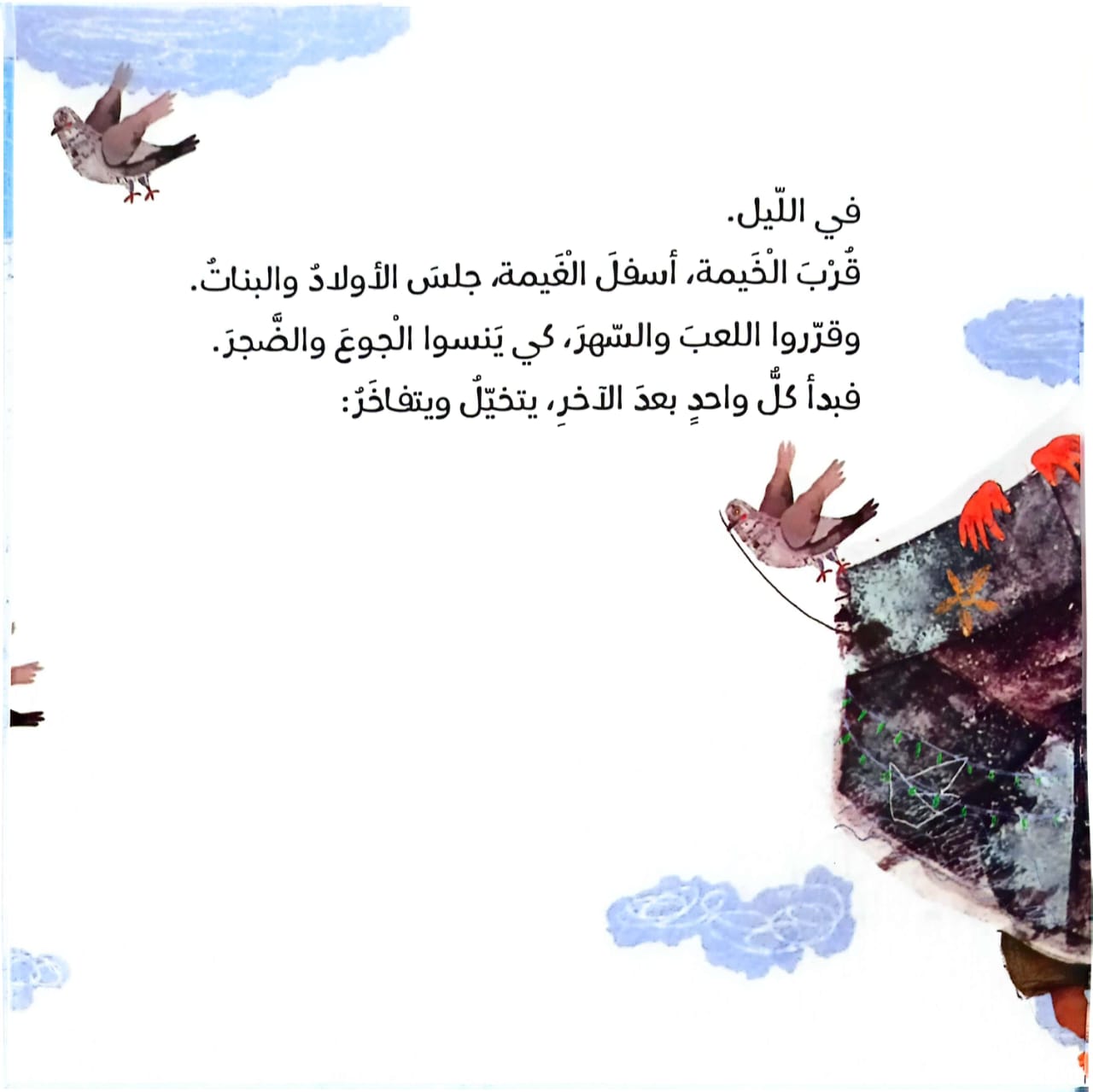 كل طفل في القصة يروي حكايةً، ينسج منها واقعًا جديدًا مليئًا بالأمل؛ فنجدهم يتجولون في شوارع نابلس، يتذوقون الكنافة في يافا، ويشربون عصير الرمان من بيسان. مغامراتهم البسيطة تضيء الأمكنة وتجلب الدفء رغم قسوة الواقع، وكأن الوطن يحتضنهم بفرحٍ ليليٍّ صامت