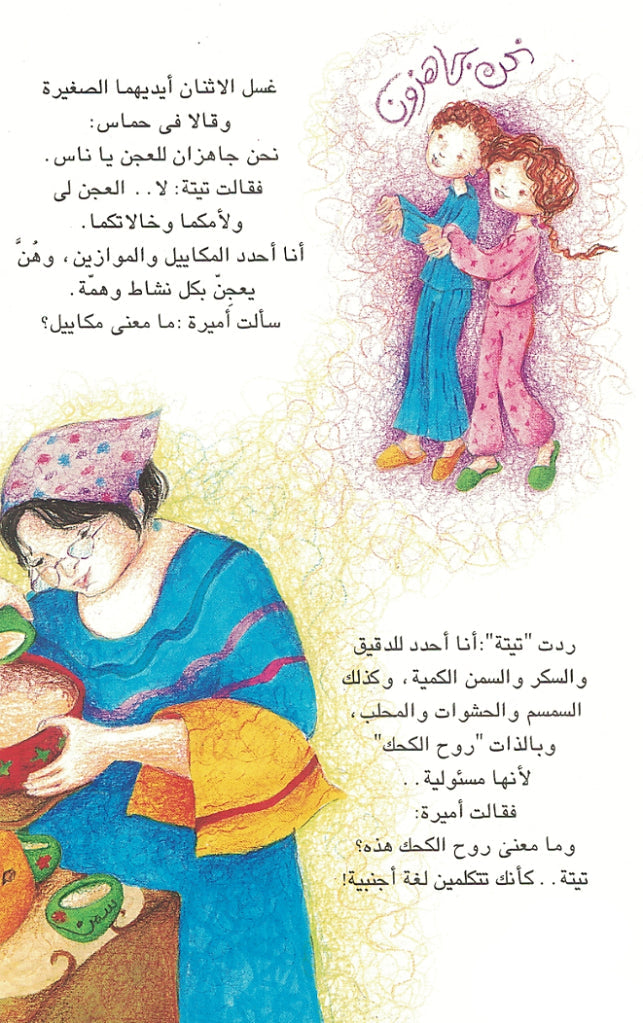 بعد تخطي الصواني المرصوصة على الأرض، يصل الطفلان لجدتهما تيتة زينب، المسؤولة عن “روح الكحك” وتحديد المكاييل والموازين بينما تقوم بنات وسيدات العائلة بالعجن بهمة ونشاط. يبدأ الصغيران في مساعدة تيتة زينب في عمل الكحك والغٌريبة والأنواع الأخرى اللذيذة من البسكويت