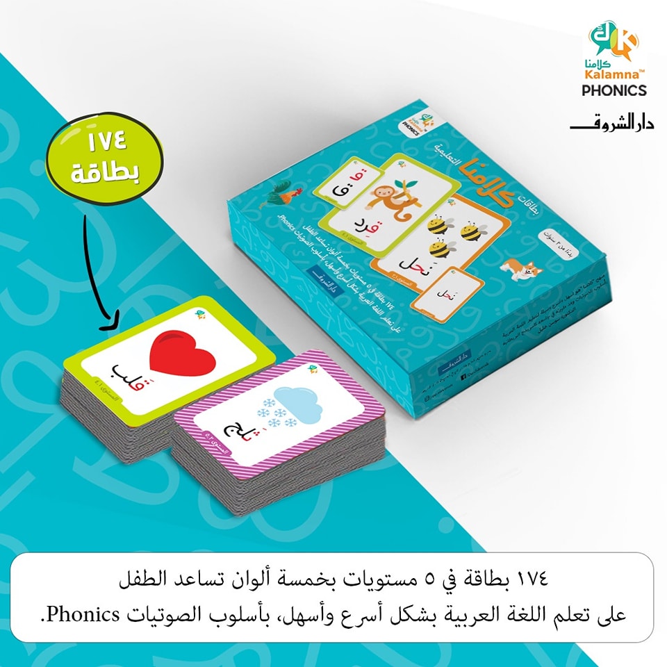 برنامج كلامنا لتعليم اللغة العربية للأطفال بنظام الصوتيات المتدرجة مقسمة لـ 5 مستويات، وهو برنامج متكامل لدعم تعلم الطفل قراءة اللغة العربية في السنوات المبكرة من حياته، وبشكل أسرع وأسهل وأمتع. - البرنامج يختلف عن الطرق التقليدية التي تعتمد على حفظ الأبجدية، فيقدم اللغة العربية من خلال أصوات الحروف، بدءا بالحروف الأكثر شيوعًا وبمفردات من حياة الطفل اليومية، ما يجعله مناسبًا لاستخدام أولياء الأمور في البيت أو للتدريس في المدارس. - بداخل البرانامج ستلاحظ الكلمات والحروف مكررة، وذلك حتى يألف الطفل شكل وصوت الكلمات عند القراء. - بظهر غلاف مجموعة الكروت والكتب موضح إرشادات كيفية استخدام البطاقات وكتب كلامنا مع الطفل، لضمان الحصول على الاستفادة الكاملة من البرنامج