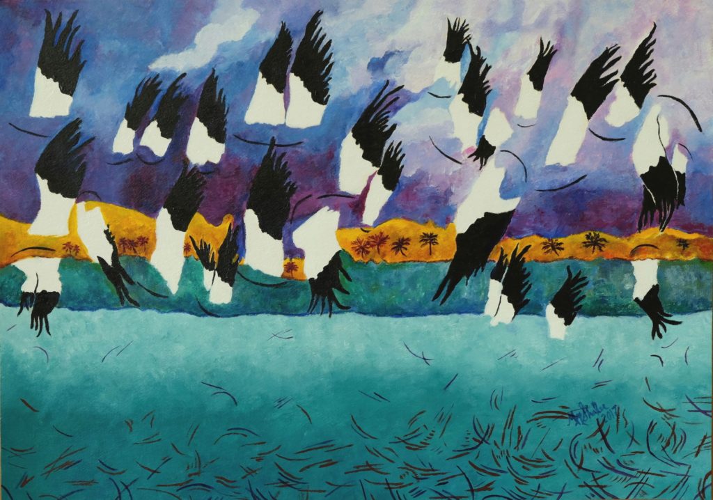 We cannot speak of sea change without speaking of the men who depend on the sea to live. In “The Fisherman” by Mario Jamal, one fisherman asks another “What are you baiting with?” The answer is “Yesterday’s dollar.” Meanwhile, only the invocations of zajal poetry bring a swamp of fish to the corniche. The fishermen shortly after walk along its cold tiles and throw their lines over the edge. In Amanj Amin’s illustrations, “Fish” and “Whale,” earth, sea, sky, and creature all come together in one seamless space.